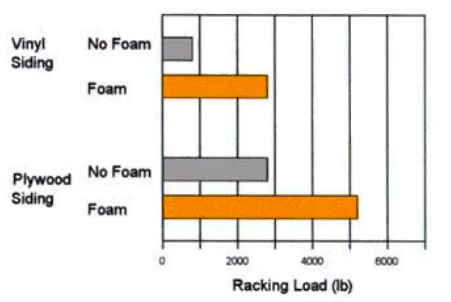 In a series of racking tests, walls with and without spray-applied polyurethane foam insulation were compared. Two exterior-facing materials were tested: