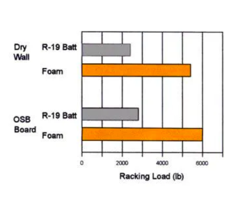 Once again, the graph indicates the greater strength of the spray foam-insulated wall system.